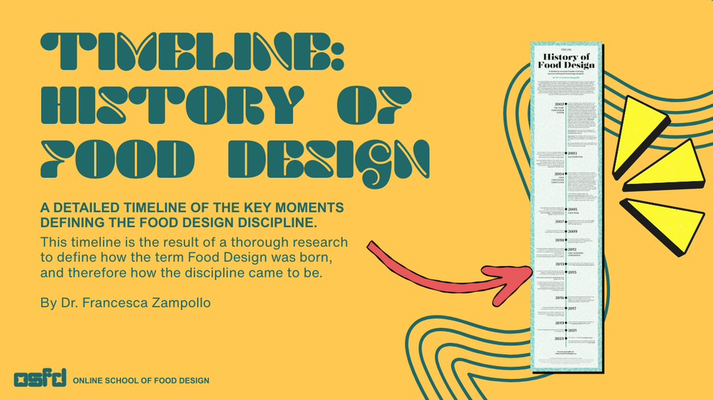 This timeline highlights key events in the development of Food Design since the term first emerged and the discipline grew into what it is today, a Design sub-discipline, similar to Fashion Design, Graphic Design, Product Design, etc. This is not a timeline of every instance where Design and innovation have been applied to food throughout human history, because those developments have been part of human evolution: from the control of fire and cooking, to the creation of tools and utensils for opening nuts, to the domestication of plants and animals, fermentation, canning, and more. Even in the previous and current century Design and innovation have been applied to the world of food and eating, both in Gastronomy and Haute Cuisine as well as Product and Industrial Design. This timeline doesn’t cover that, but is instead a comprehensive account of the Food Design discipline since the moment the name was created, and highlights the steps made by academia and independent food designers to establish it.